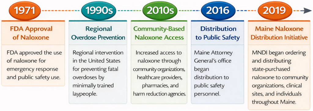 - 2019 – Maine Naloxone Distribution Initiative (MNDI) began ordering and distributing state-purchased naloxone to community organizations, clinical sites, and individuals throughout Maine.